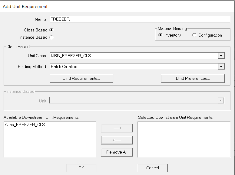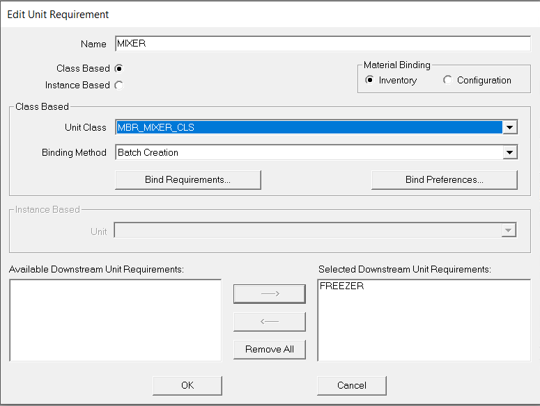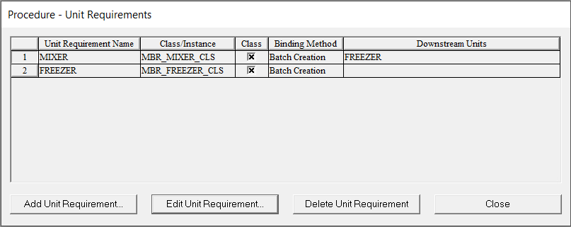 North_Parlor 有两个可用于生产巧克力榛子冰淇淋的单元。在区域模型中,有两个基于 MBR_MIXER_CLS 单元类的单元实例(NP_MIXER_1 和 NP_MIXER_2)和两个基于 MBR_FREEZER_CLS 单元类的单元实例(NP_FREEZER_1 和 NP_FREEZER2)。您希望操作员在创建批次时选择使用哪个混合器和冷冻机。为此,需要创建一个配置为 MBR_MIXER_CLS 单元类的单元需求名称(MIXER)和一个配置为 MBR_FREEZER_CLS 单元类的单元需求名称(FREEZER)。您还需要选择批次创建绑定方法。 - 如果未启用“基于类”部分,请选择 基于类 选项。