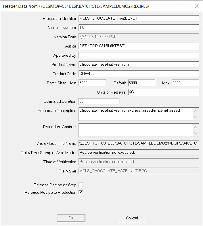 - 启用 已发布至生产,以便在 FactoryTalk Batch 视图中将批次添加到批次列表时显示此配方。