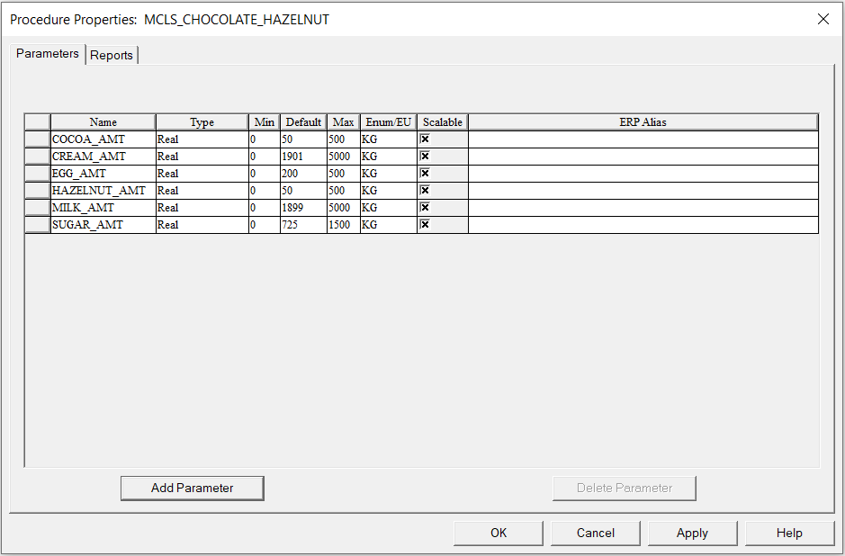- 从 配方 菜单中,选择 配方参数/报表。打开“程序属性”对话框。按图中所示输入配方公式参数。