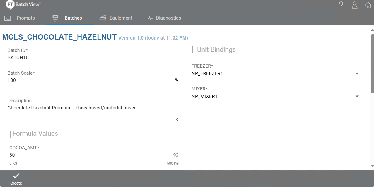 - 在Batches页面,点击 添加 按钮,选择 MCLS_CHOCOLATE_HAZELNUT,然后点击 确定。此时将打开“批次创建”对话框。